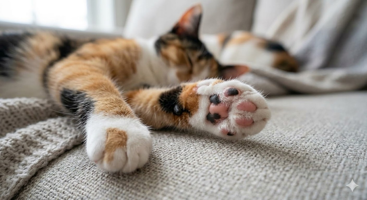 This photo captures a calico cat in a state of total bliss, sprawled out for a nap on a cozy, neutral-toned sofa. The image highlights the unique and beautiful patchwork pattern that makes calicos so special.
