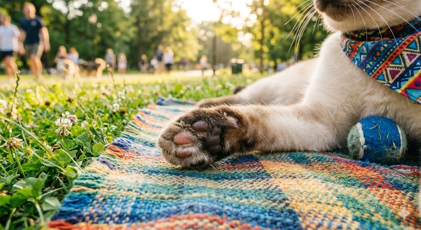 This image features a close-up of a Siamese cat’s dainty paw, highlighting those famous “toe beans.” The cat is relaxing outdoors, soaking up the sun in a vibrant park setting.