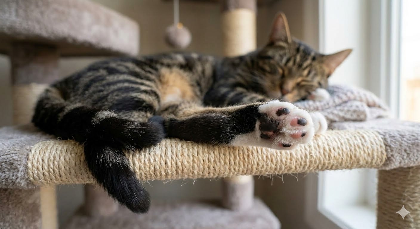 This photo features a classic brown tabby cat enjoying a deep sleep on the top tier of a sisal-wrapped cat tree. The perspective emphasizes the cat’s relaxed, sprawling posture in its favorite high-up hideaway.